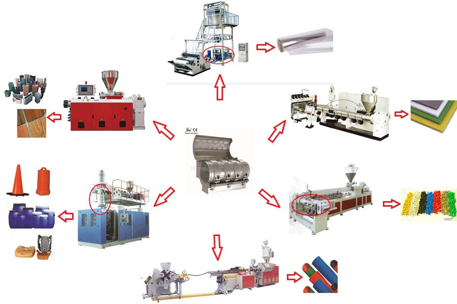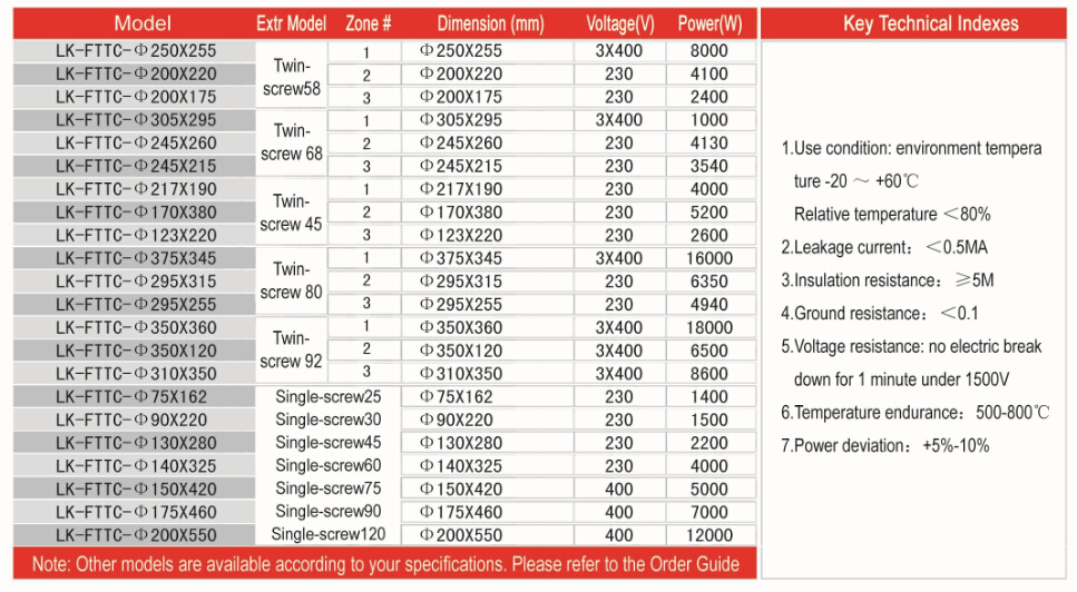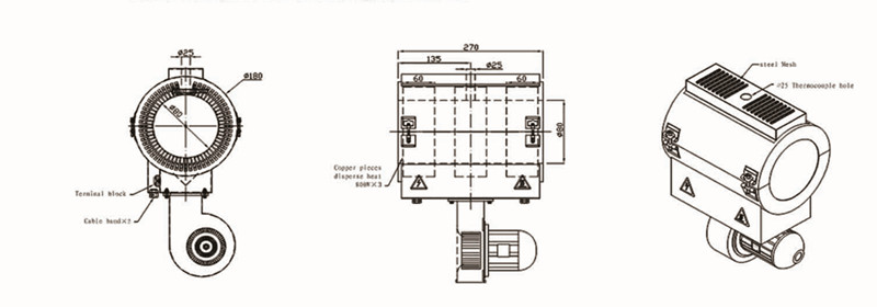 It is mainly used for complete extrusion parts. It consists of several heaters connected with temperature reducing systems. Depending on specific application requirements, the number and layout of this item can be combined into one system. As the extrusion cylinder is completely covered, it has a uniform temperature flow. Also due to the enlarged surface of heating radiation, the efficiency is improved. It can remove friction heat from extrusion. The air cooling ceramic heater with copper cooling fins consists of several band heaters. Then the set is covered by an individual mounted cooling jacket with a fan connection box and air outlet device fixed. In addition, the band heater can be removed and replaced. The maximum temperature the heater can stand is 500 ¡ãC. Currently, this heater is the most advanced cooling & heating device for extrusion machine and cylinder of injection plastic machine.