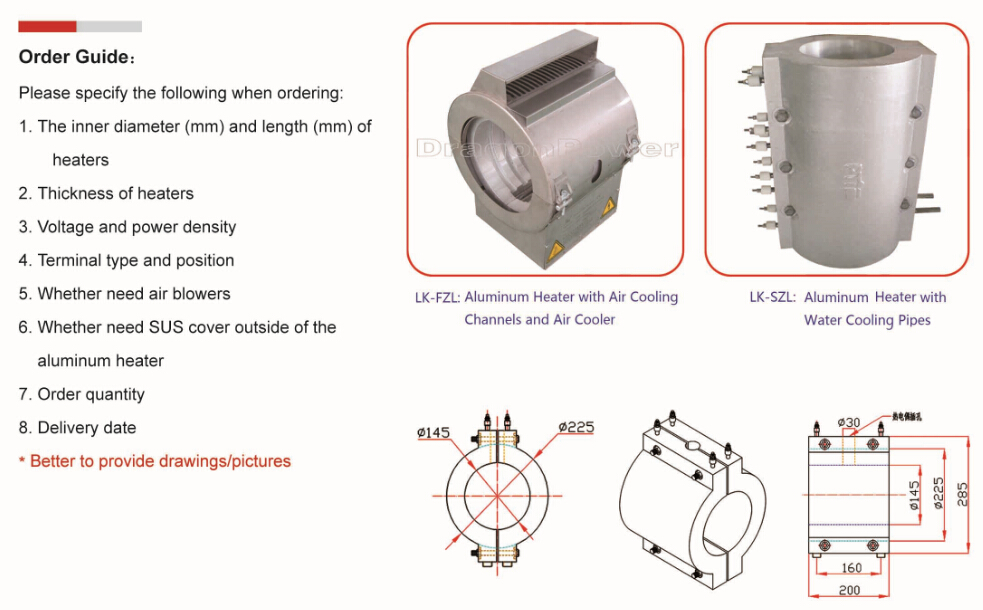 Different sizes and watt density of air cooling aluminum heaters are available. Our aluminum heaters are customized according to your specifications.