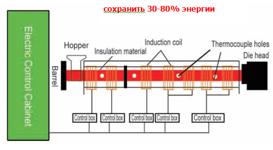 Электромагнитный индукционный нагреватель используется главным образом в машины литья под давлением пластмасс (резиновые), экструдер, выдувные машины пленкой, волочильной машины, пластиковой пленки, трубы, провода и так далее. Отопление электромагнитные методы прямого нагрева (ствол Отопление), выходят за ствол и оболочку с Утеплители и изоляции вокруг проволоки, с помощью электромагнитной индукции вызывает ствол иметь Эдди тепла, значительно уменьшает потери тепла и тепло-потери воздуха и улучшает тепловой эффективности, избегая рост температуры окружающего воздуха, тем самым значительно, экономя до 30% ~ 80%. Катушки электромагнитные Отопление, сам не нагревается и изготовлен из керамического материала и высокой температуры кабельного производства, поэтому нет никаких электрическое отопление катушки сопротивления проволоки в высокой температуры окисления и сократить срок службы этого вопроса и имеет длительный срок службы, преимущества быстрого нагревания, нет необходимости для обслуживания, сокращение времени обслуживания и снижает затраты.